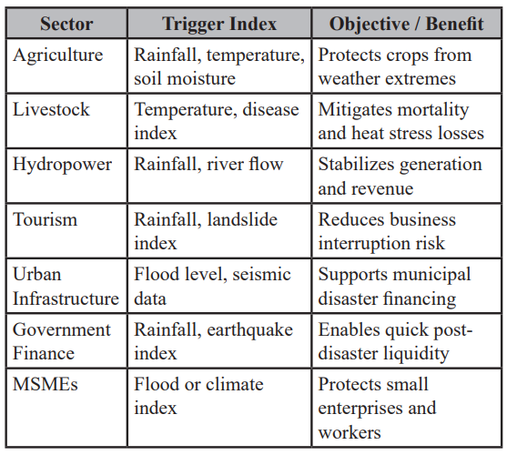 It is particularly useful in developing and climate-vulnerable countries, where small farmers and microenterprises often lack access to traditional insurance. Index-based products provide affordable protection and promote climate-resilient livelihoods (Greatrex et al., 2015).