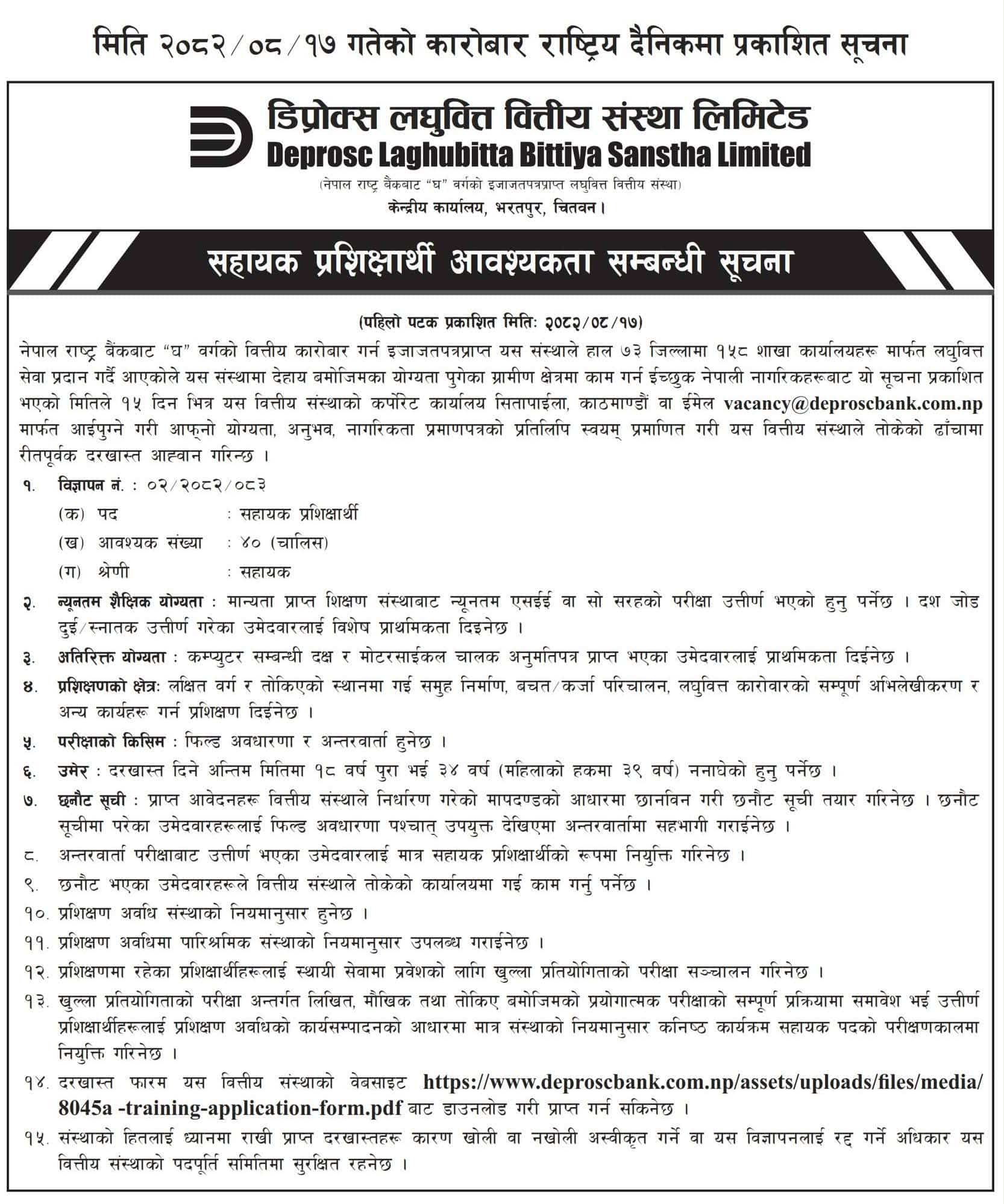 डेप्रोक्स लघुवित्तमा ठुलो संख्यामा रोजगारीको अवसर, सहायक प्रशिक्षार्थीका लागि दरखास्त आह्वान