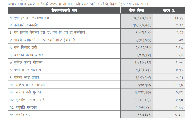 शेयर स्वामित्वमा देखिएको यो परिवर्तनले बैंकको लगानी संरचना थप विविध बन्दै गएको संकेत गरेको छ भने विदेशी तथा संस्थागत लगानीकर्ताको भूमिकालाई पनि मजबुत बनाएको छ ।