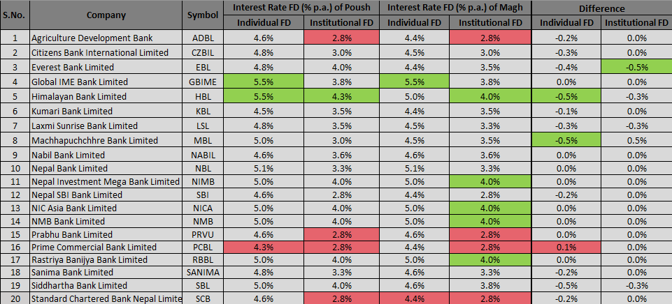 यता ग्लोबल आइएमई बैंक, नबिल बैंक, नेपाल इन्भेस्टमेन्ट मेगा बैंक, नेपाल बैंक, एनआइसी एशिया बैंक, एनएमबी बैंक, प्रभु बैंक, राष्ट्रिय वाणिज्य बैंक तथा प्राइम कमर्सियल बैंकले भने पुस महिनाकै ब्याजदरलाई कायम राखेका छन्।