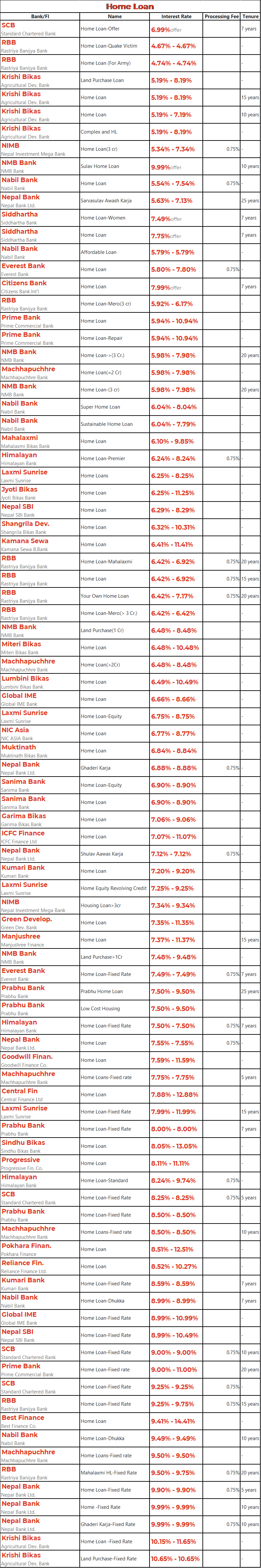 माछापुच्छ्रे बैंकले २ करोड बराबरको घर कर्जाका लागि ५.९८ प्रतिशत व्याजदर कायम गरेको छ। दुई करोड भन्दा कम व्याजदरका लागि बैंकले ६.४८ प्रतिशतमा कर्जा प्रवाह गरिरहेको छ। ५ वर्षको फिक्सड हुने गरी ७.७५ प्रतिशत कायम गरेको छ। १० वर्षको फिक्स्ड हुने गरी ८.५० प्रतिशतमा दिइरहेको छ।