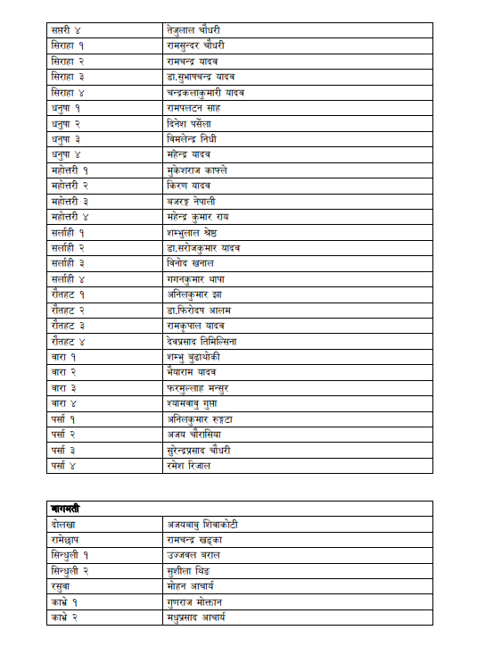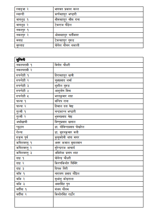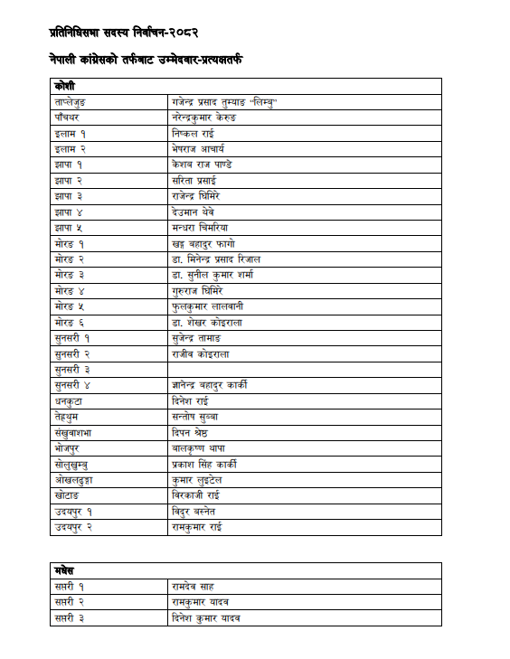 सुनसरी–३ मा विजयकुमार गच्छदार र बेदनारायण गच्छदार दुवैका नाममा टिकट गए पनि विजयकुमार गच्छदारले उम्मेदवारी दर्ता गराइसकेका छन्। नवलपुर–१ मा बालकृष्ण घिमिरे र नवलपरासी–२ मा देवेन्द्रराज कँडेल कांग्रेसका उम्मेदवार बनेका छन्।