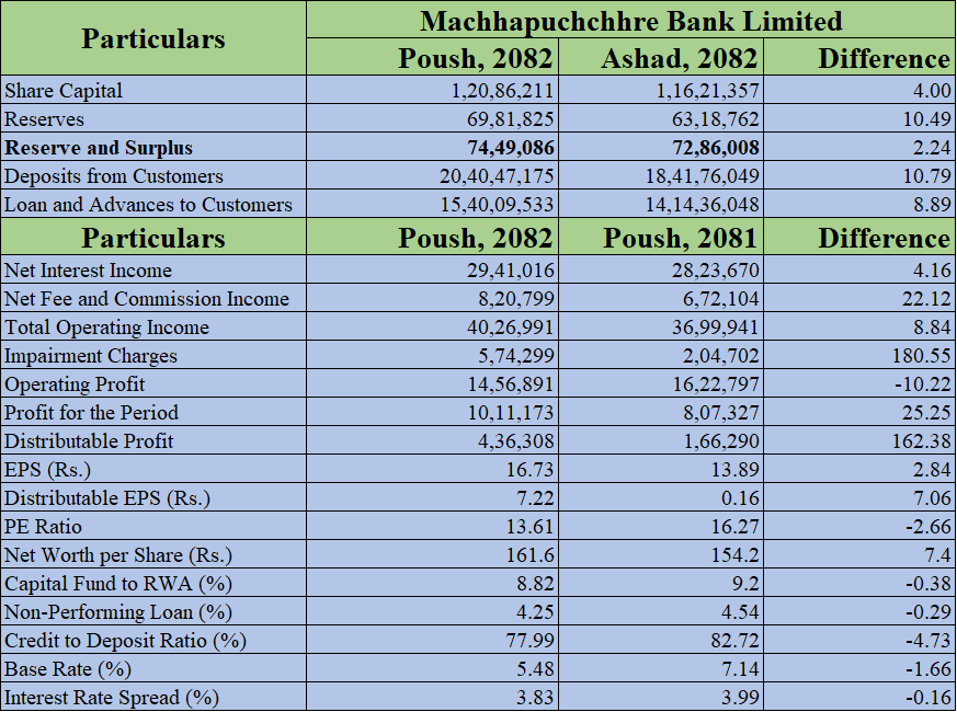 १२ अर्ब ८ करोड रुपैयाँ चुक्ता पूँजी रहेको माछापुच्छ्रे बैंकको जगेडा कोषमा ६ अर्ब ९८ करोड रुपैयाँ सञ्चित छ। बैंकले पुस मसान्तसम्म २ खर्ब ४ अर्ब रुपैयाँ निक्षेप संकलन गरी १ खर्ब ५४ अर्ब रुपैयाँ कर्जा प्रवाह गरेको छ।