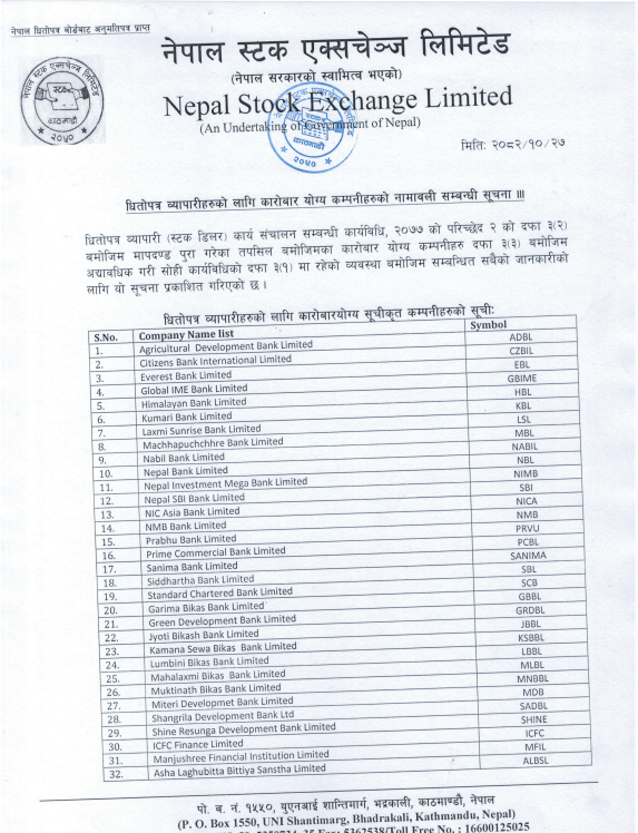 स्टक डिलरमार्फत कारोबार गर्न योग्य कम्पनीहरूको सूची सार्वजनिक