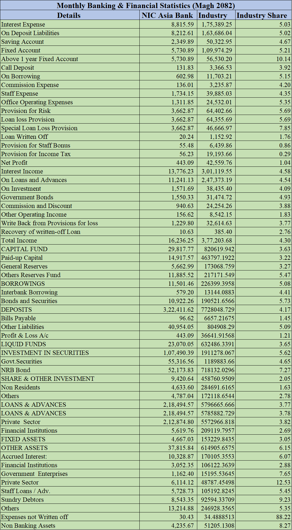 The bank’s capital fund stands at Rs 29,817.77 million, accounting for 3.63 percent of the total banking industry capital base. Paid-up capital forms roughly half of this amount, supported by general reserves and other reserve funds.