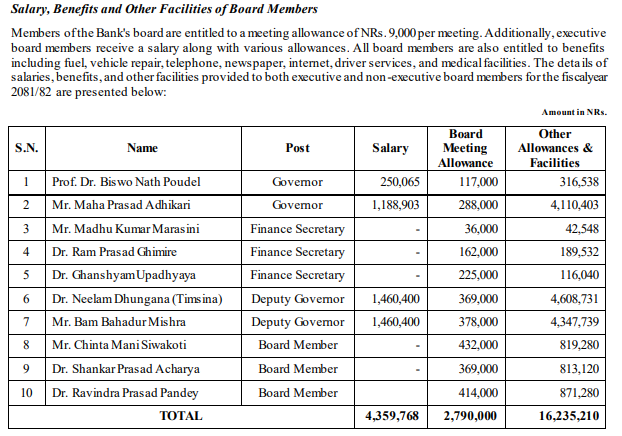 गत आर्थिक वर्ष २०८१/८२ मा अवकाश प्राप्त गभर्नर महाप्रसाद अधिकारी ले ११ लाख ८८ हजार ९०३ रुपैयाँ तलब, सञ्चालक समितिको बैठक भत्ता बापत २ लाख ८८ हजार रुपैयाँ र अन्य सेवा–सुविधा बापत ४१ लाख १० हजार ४०३ रुपैयाँ बुझेका थिए। उनीपछि नियुक्त भएका गभर्नर प्रा. डा. विश्वनाथ पौडेल ले २०८२ असारसम्म २ लाख ५० हजार रुपैयाँ तलब, १ लाख १७ हजार रुपैयाँ बैठक भत्ता र ३ लाख १६ हजार ५३८ रुपैयाँ अन्य भत्ता तथा सुविधा पाएका थिए।