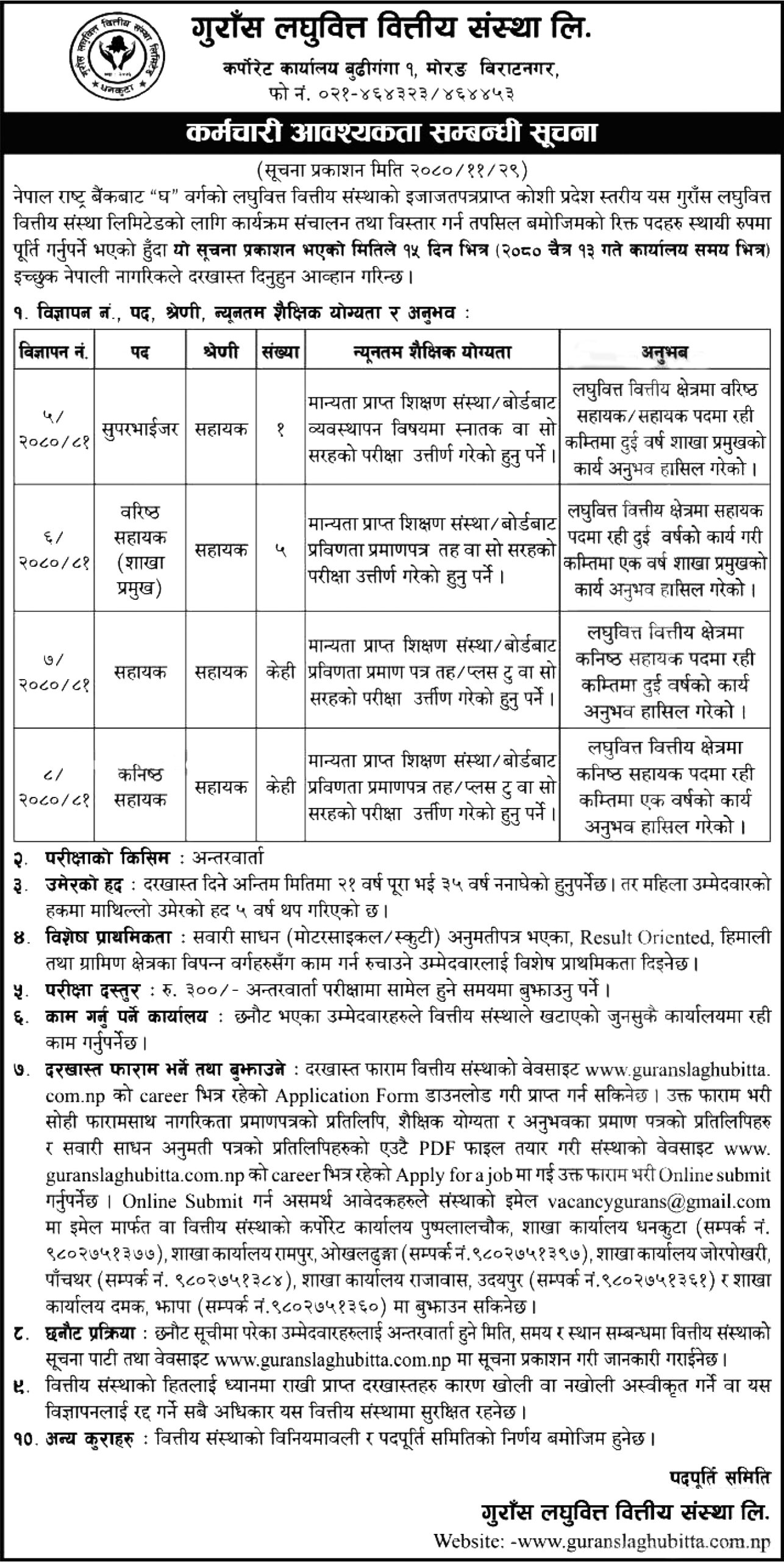 काठमाडौं । गुराँस लघुवित्त वित्तीय संस्था लिमिटेडले कर्मचारी माग गरेको छ। कम्पनीले सुपरभाइजरदेखि कनिष्ठ सहायकसम्मका पदका लागि विज्ञापन खुलाएको हो।