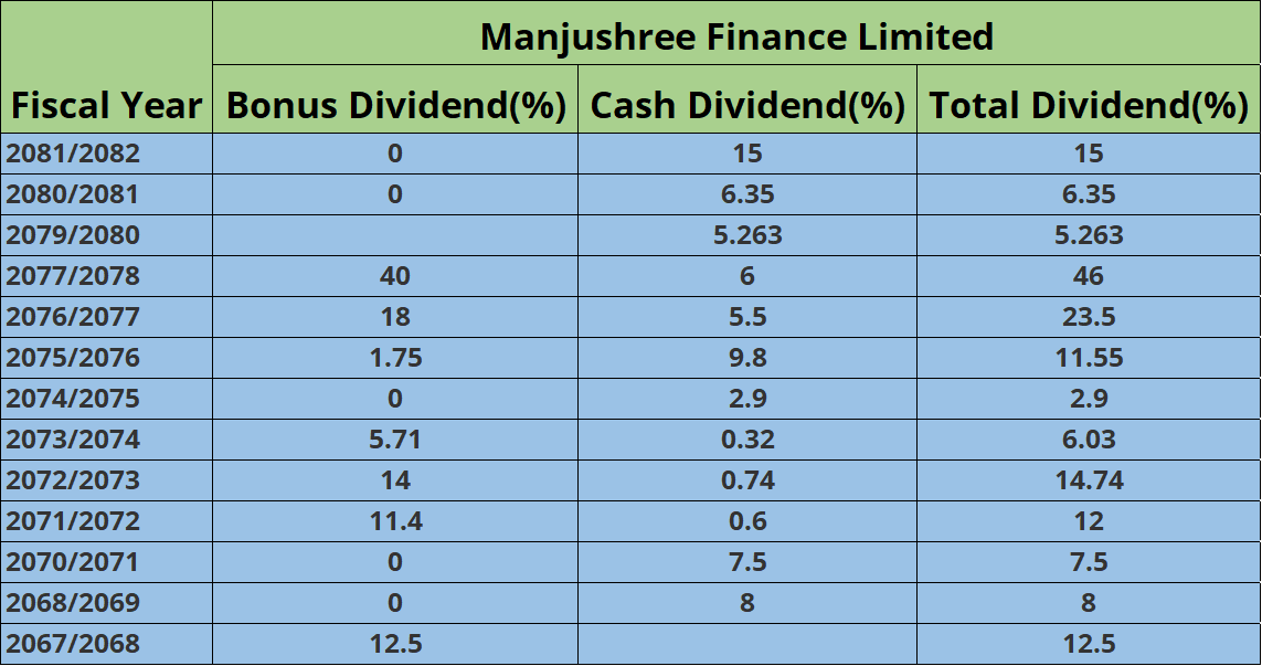 मञ्जुश्री फाइनान्स लिमिटेडले स्थायित्वपूर्ण वित्तीय प्रदर्शन कायम राख्दै नियमित रूपमा शेयरधनीहरूलाई प्रतिफल दिँदै आएको छ।