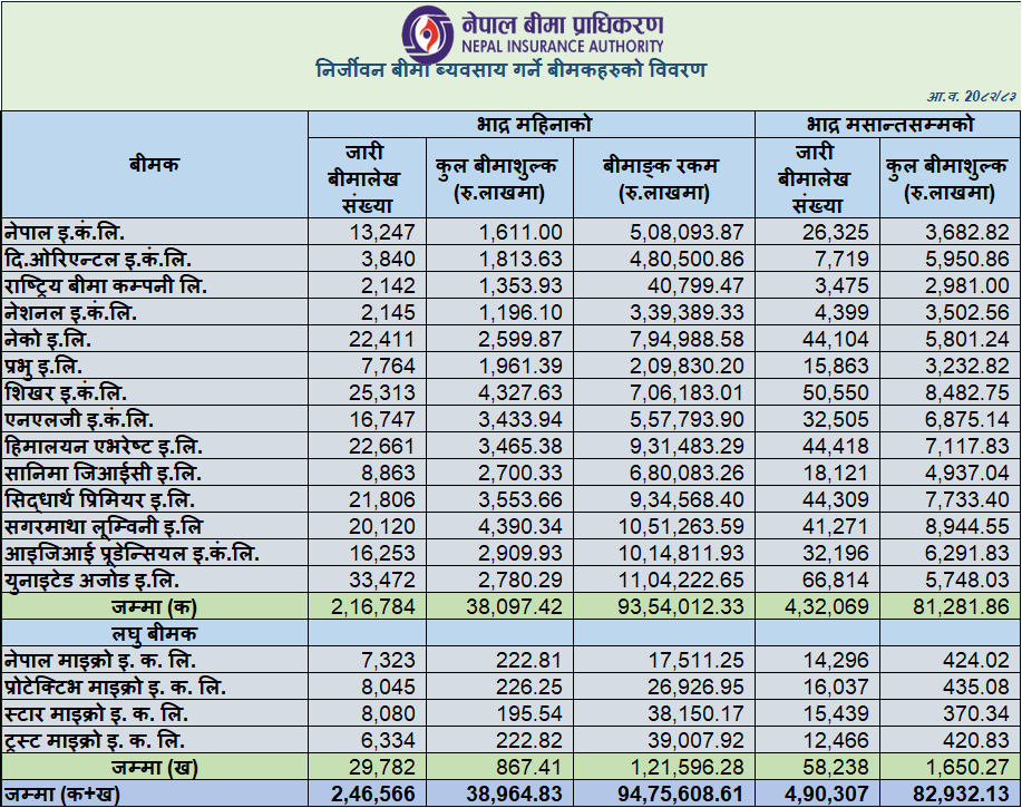 निर्जीवन बीमा कम्पनीहरुले दुई महिनामा संकलन गरे ८ अर्ब २९ करोड बीमा शुल्क, सलिको र शिखर अगाडि