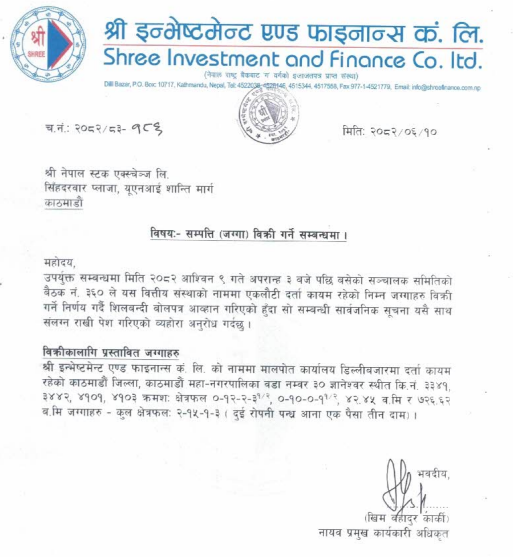 काठमाडौं। श्री इन्भेष्टमेन्ट एण्ड फाइनान्सले ज्ञानेश्वरमा रहेको २ रोपनी १५ जना जग्गा बिक्री गर्ने भएको छ। कम्पनीले आफ्नो नाममा रहेको उक्त जग्गा बिक्रीका लागि सार्वजनिक सूचना आह्वान गरेको छ।