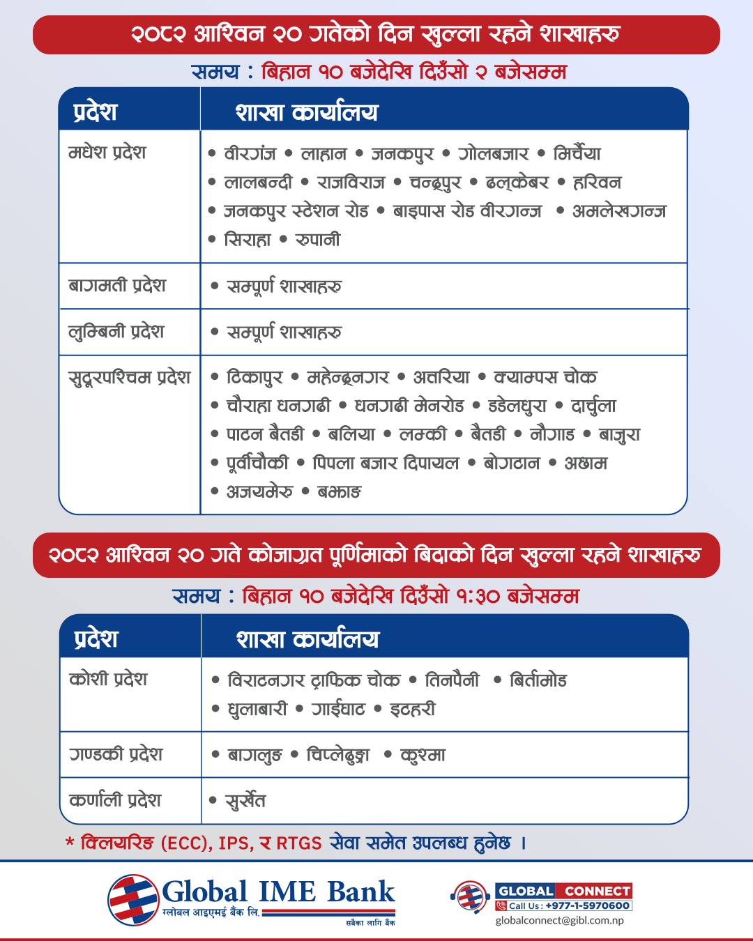 त्यस्तै, असोज २० गतेका दिन बिहान १० बजेदेखि दिउँसो २ बजेसम्म पनि केही शाखाहरू सञ्चालनमा रहने बैंकले जनाएको छ।