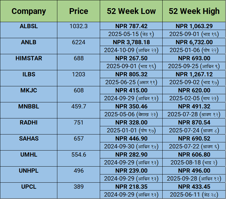 यस क्रममा अधिकाम्स कम्पनीको शेयर मूल्य तल्लो विन्दुमा झरेको छ। यस अवधिमा पनि केहि यस्ता कम्पनी छन् जसले वर्षदिनभरिकै सर्वाधिक मूल्य बनाउन सफल देखिएका छन्।