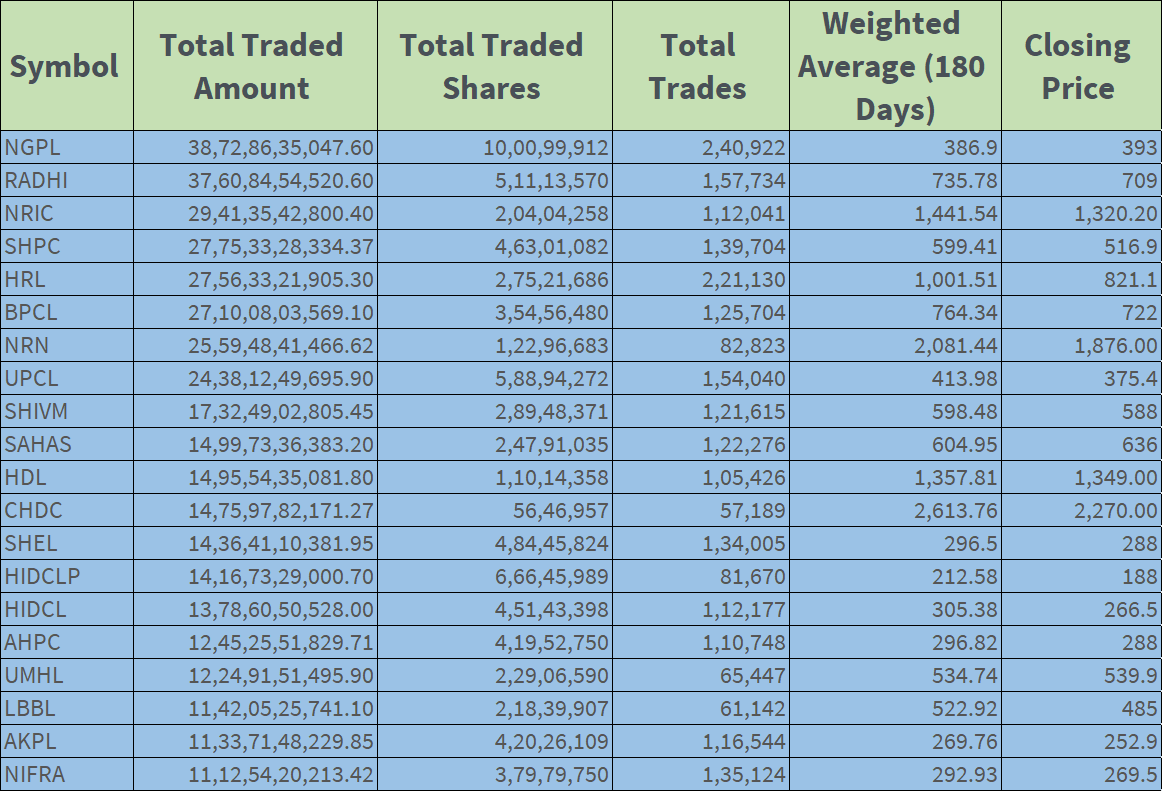 यस बाहेक पछिल्लो १८० कारोबार दिनलाई आधार मान्ने हो भने लगानीकर्ताको सर्वाधिक रोजाइमा ङादी ग्रुप पावर परेको छ। यसको मात्रै यस अवधिमा ३८ अर्ब ७२ करोडको खरिद बिक्री भएको छ। दोस्रो धेरै कारोबार राधि विद्युतको ३७ अर्ब ६० करोडको भएको छ। यसरी पहिलो र दोस्रो धेरै रोजाइमा जलविद्युत परेका छन्। यस पछिको तेस्रो रोजाइमा नेपाल पुनर्बीमा कम्पनी परेको छ। यसको पनि यस अवधिमा २९ अर्ब ४१ करोडको खरिद बिक्रि भएको छ। यस पछिको रोजाइमा सानिमा माइ हाइड्रोपावर परेको छ। यसको पनि समिक्षा अवधिमा २७ अर्ब ७५ करोडको खरिद बिक्रि भएको छ। यस पछि हिमालयन रिइन्स्योरेन्सको २७ अर्ब ५६ करोडको खरिद बिक्री भएको छ।