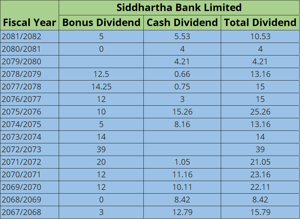 बैंकले यस लाभांशमार्फत शेयरधनीहरूलाई पूँजीगत लाभ र नगद दुवै किसिमको प्रतिफल दिने भएको छ। साथै, बैंकले आगामी वर्षमा यसभन्दा दोब्बर लाभांश वितरण गर्ने क्षमता रहेको छ। ऋणपत्र परिपक्व हुँदै गएसँगै बैंकका शेयरधनीका लागि आगामी दिनहरू थप आशाजनक हुने देखिएको छ। हाल सिद्धार्थ बैंकको शेयर मूल्य ३५३ रुपैयाँमा कारोबार भइरहेको छ।