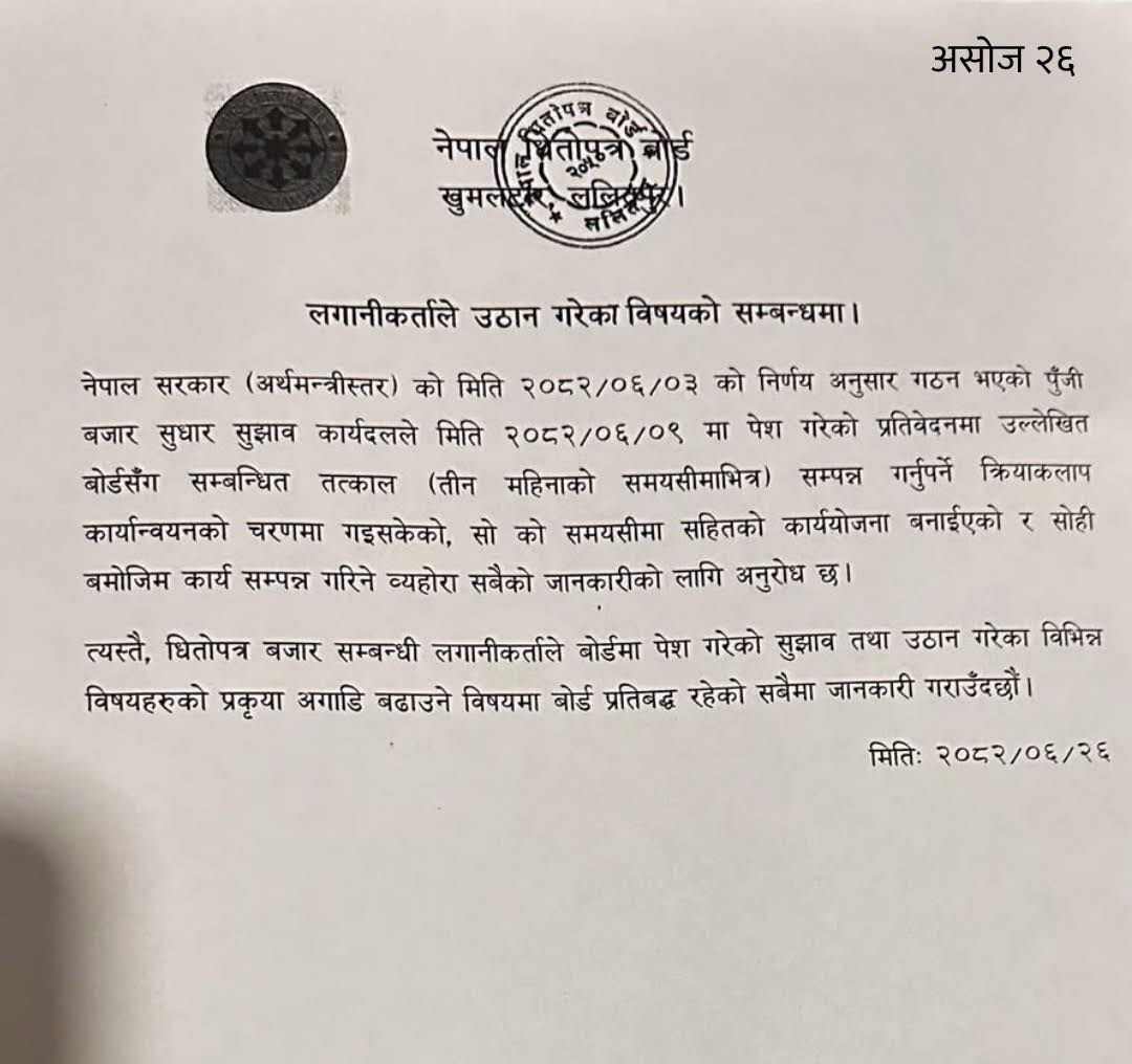 यसैबीच, नेपाल धितोपत्र बोर्डले लगानीकर्ताले उठाएका विषयहरू कार्यान्वयनको प्रक्रियामा रहेको भन्दै स्पष्टिकरण दिएको छ। बोर्डले विज्ञप्ति जारी गर्दै अर्थ मन्त्रालयको मिति २०८२ असोज ३ गतेको निर्णय अनुसार गठित “पुँजी बजार सुधार सुझाव कार्यदल” ले असोज ९ गते पेश गरेको प्रतिवेदनमा उल्लिखित तत्काल कार्यान्वयन गर्नुपर्ने क्रियाकलापहरू चरणबद्ध रूपमा अघि बढिरहेको जनाएको छ।