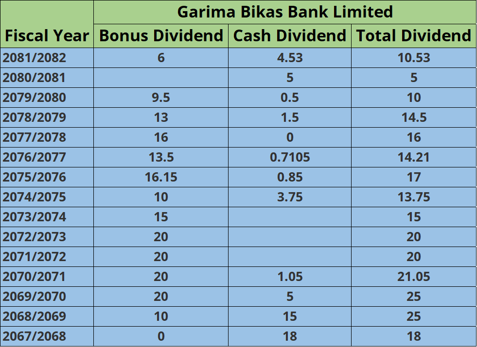गरिमा विकास बैंक हाल देशभर विभिन्न स्थानमा सेवा विस्तार गर्दै आएको छ र देशका प्रमुख विकास बैंकहरूमध्ये एकको रूपमा परिचित छ। विगतका वर्षहरूमा पनि नियमित रूपमा आकर्षक लाभांश वितरण गर्दै आएको यस बैंकले शेयरधनीहरूको लगानीमा सकारात्मक प्रतिफल दिँदै आएको छ।