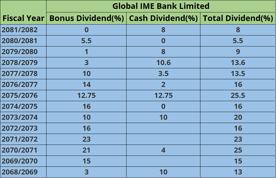 ग्लोबल आइएमई बैंक नेपालको एक अग्रणी वाणिज्य बैंक हो, जसले प्रत्येक वर्ष नियमित रूपमा आफ्ना शेयरधनीहरूलाई लाभांश वितरण गर्दै आएको छ। बैंकको यो निर्णयले लगानीकर्तामा सकारात्मक सन्देश दिने विश्वास गरिएको छ।