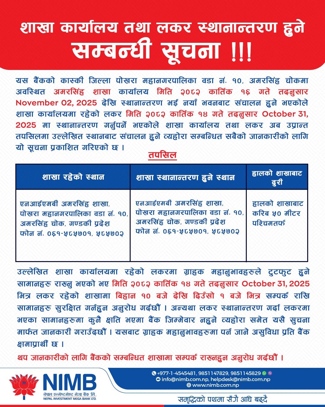 पोखरा । नेपाल इन्भेष्टमेन्ट मेगा बैंक लिमिटेडले कास्की जिल्लाको पोखरा महानगरपालिका–१०, अमरसिंहचोकमा अवस्थित आफ्नो अमरसिंह शाखा कार्यालय नयाँ भवनमा स्थानान्तरण गर्न लागेको छ । बैंकले जारी गरेको सूचनाअनुसार शाखा कार्यालय मिति २०८२ कार्तिक १६ गतेदेखि नयाँ स्थानबाट सञ्चालन हुने भएको हो ।
