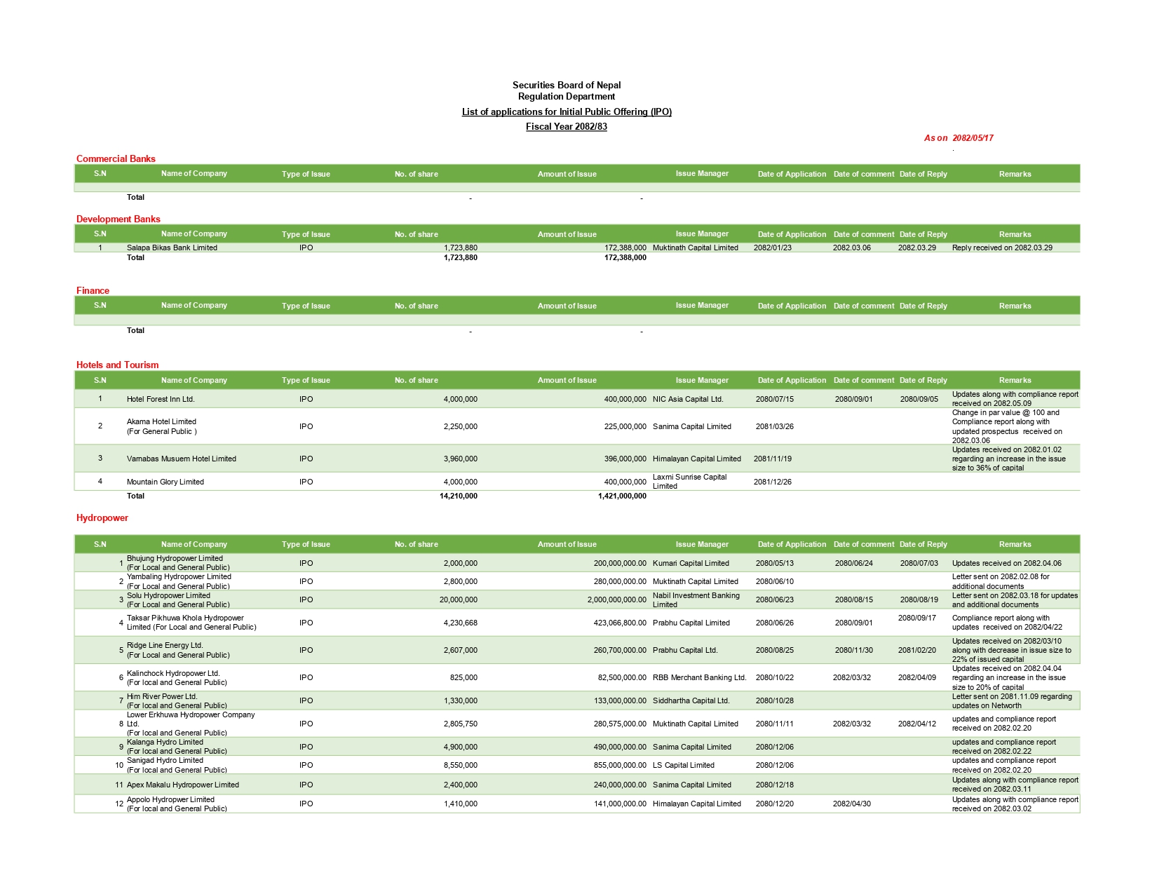 त्यस्तै जलविद्युत समुहबाट ३७ वटा कम्पनीले १८ अर्ब २६ करोडको आइपिओ निष्काशन गर्दै छन्। धितोपत्र बोर्डले पछिल्लो समय संशोधन गर्ने धितोपत्र निष्काशन सम्बन्धी निर्देशिका अनुसार धेरै वटा जलविद्युत कम्पनीहरुले आवेदन दिए पनि सार्वजनिक निष्काशनका लागि योग्य देखिएका छैनन्। धितोपत्र बोर्डका कारण जलविद्युत कम्पनीले आइपिओ निष्काशन गर्न नपाएको भन्दै स्वतन्त्र उर्जा उत्पादक संघले पत्रकार सम्मेलन नै गरेर विरोध जनाएको थियो।