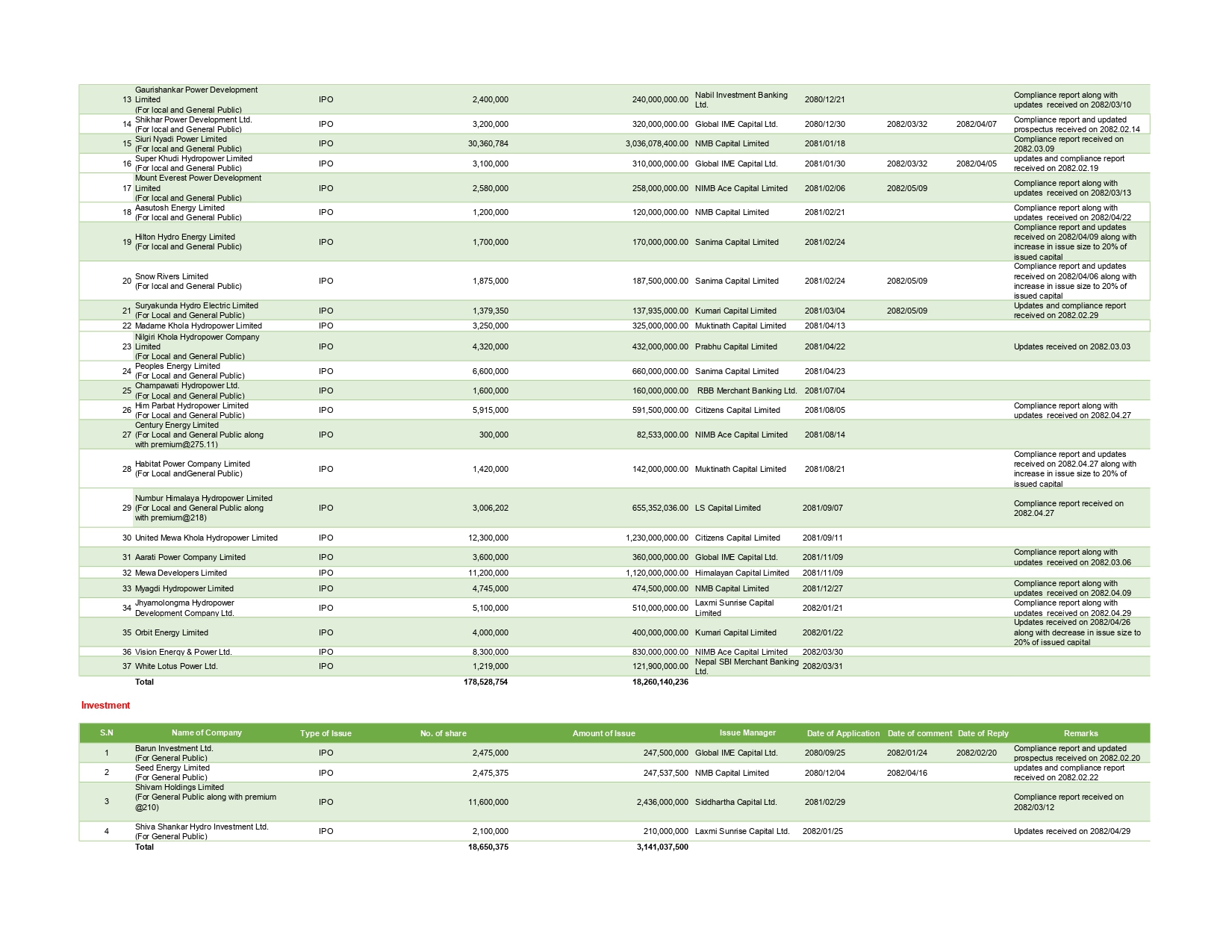 इन्भेष्टमेन्ट कम्पनीहरुको तर्फबाट ३ वटाले तीन अर्ब १४ करोड रुपैयाँको आइपिओ निष्काशनका लागि निवेदन दिएका छन्। पछिल्लो समय शेयर बजारमा उत्पादन तथा प्रशोधनमुलक कम्पनीहरु आइपिओ निष्काशनका लागि आकर्षित देखिएका छन्। यस समुहबाट पनि १६ वटा कम्पनीले २७ अर्ब ४ करोड रुपैयाँको आइपिओ निष्काशनको अनुमति माग्दै आवेदन दिएका छन्।