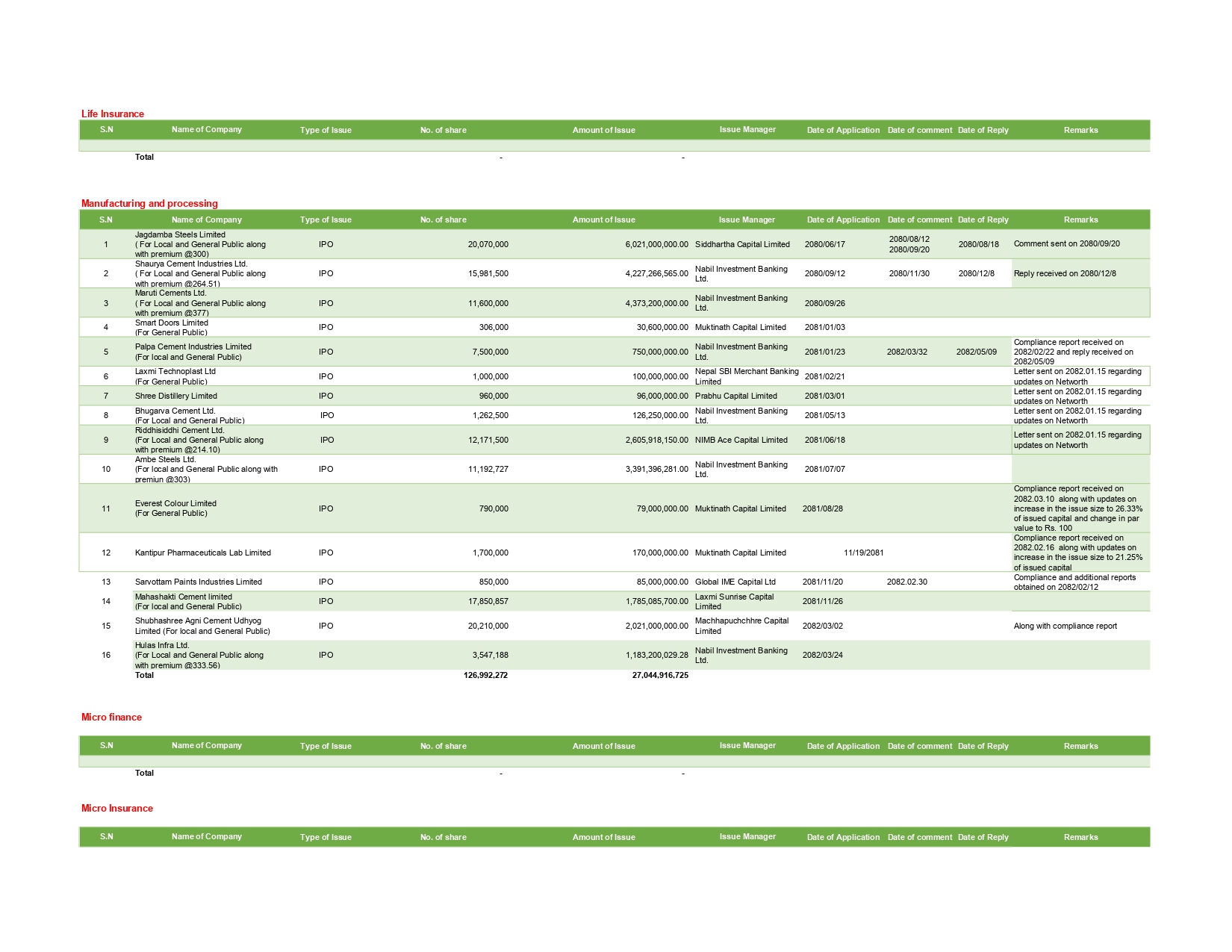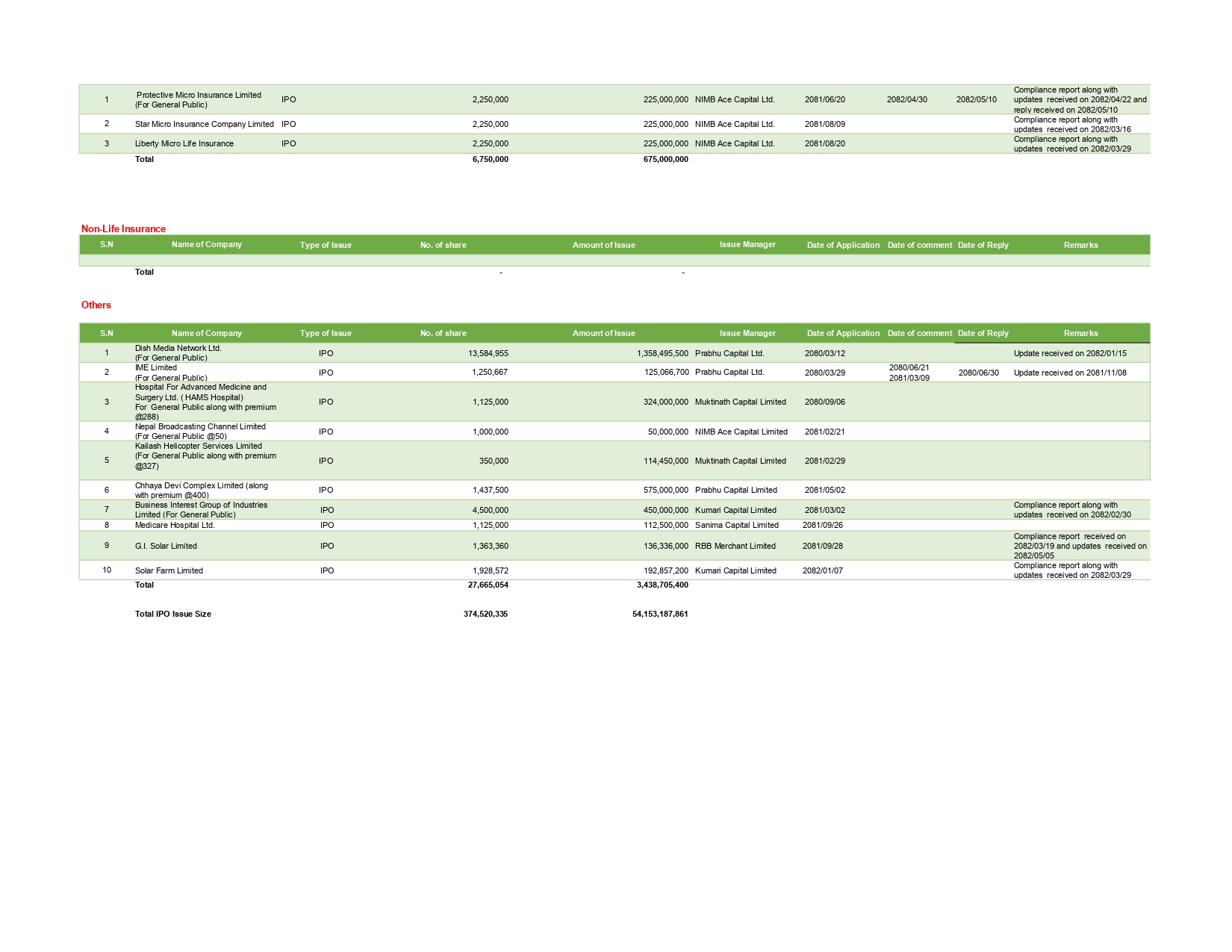 लघु बीमा कम्पनी तर्फ पनि तीन वटाले ६७ करोड ५० लाख रुपैयाँको आइपिओ निष्काशन गर्दै छन्। अन्य समुह तर्फ १० वटाको आवेदन परेको छ। उनिहरुले तीन अर्ब ४३ करोड रुपैयाँको आइपिओ निष्काशन गर्दै छन्।