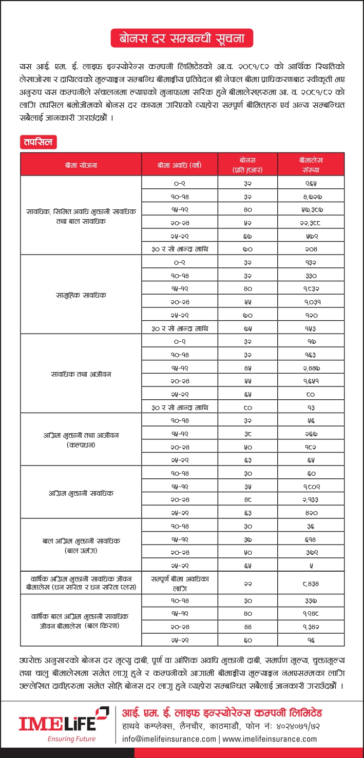 सावधिक, सीमित अवधि भुक्तानी सावधिक तथा बाल सावधिक बीमा योजनामा बीमा अवधि अनुसार प्रतिहजार न्यूनतम ३२ देखि अधिकतम ७० रुपैयाँसम्म बोनस निर्धारण गरिएको छ। सामूहिक सावधिक बीमामा बोनसदर ३२ देखि ७५ रुपैयाँसम्म छ भने सावधिक तथा आजीवन बीमामा ३२ देखि ८० रुपैयाँसम्म बोनस लागू हुनेछ।