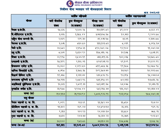 निर्जीवन बीमा व्यवसाय चार महिनामा साढे १२ प्रतिशतले बढ्यो, सगरमाथा लुम्बिनी शीर्षस्थानमा