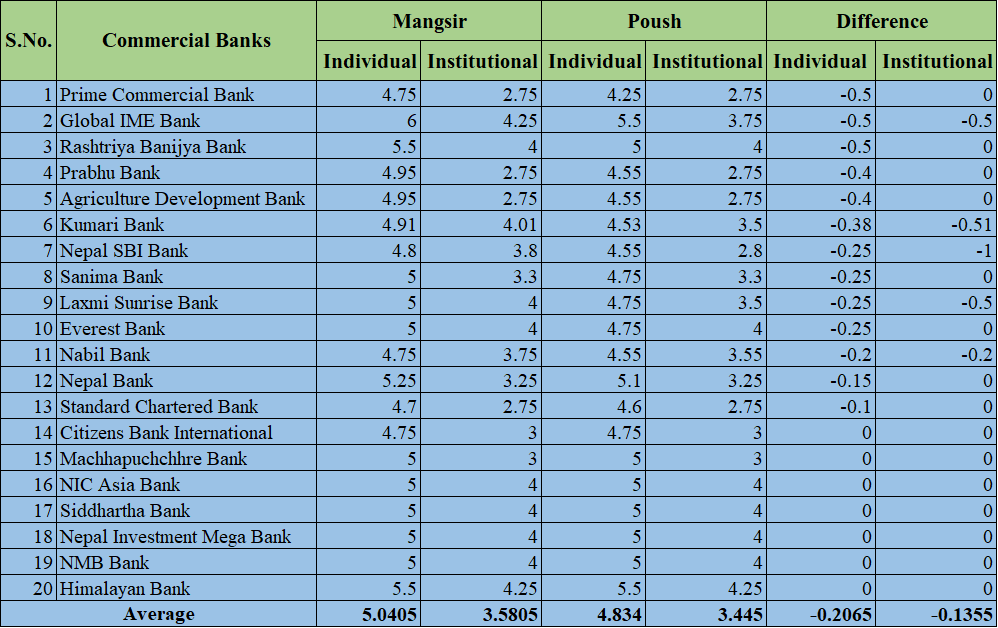 मंसिर महिनाको तुलनामा पुस महिनामा १३ वाणिज्य बैंकले व्यक्तिगत मुद्दति निक्षेपको अधिकतम ब्याजदर घटाएका छन्। प्राइम कमर्सियल बैंक, ग्लोबल आइएमई बैंक र राष्ट्रिय वाणिज्य बैंकले समान ०.५ प्रतिशतविन्दुले ब्याजदर घटाएका हुन्। त्यसैगरी प्रभु बैंक र कृषि विकास बैंकले ०.४ प्रतिशतविन्दुले ब्याजदर घटाएका छन् भने कुमारी बैंकको ब्याजदर ०.३८ प्रतिशतविन्दुले घटेको छ।