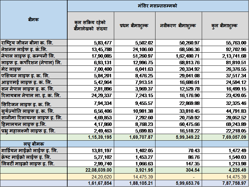 नेपालमा सञ्चालित १४ वटा जीवन बीमा कम्पनीहरूले चालु आर्थिक वर्षको मंसिर महिनामा मात्रै १४ अर्ब ६८ करोड रुपैयाँ बराबरको कुल बीमा शुल्क आर्जन गरेका छन्। नेपाल बीमा प्राधिकरणका अनुसार यो रकम गत आर्थिक वर्षको सोही अवधिको तुलनामा १८.९४ प्रतिशतले बढी हो। अघिल्लो वर्षको सोही अवधिमा जीवन बीमा कम्पनीहरूले १२ अर्ब ३४ करोड ८६ लाख रुपैयाँ बीमा शुल्क आर्जन गरेका थिए।