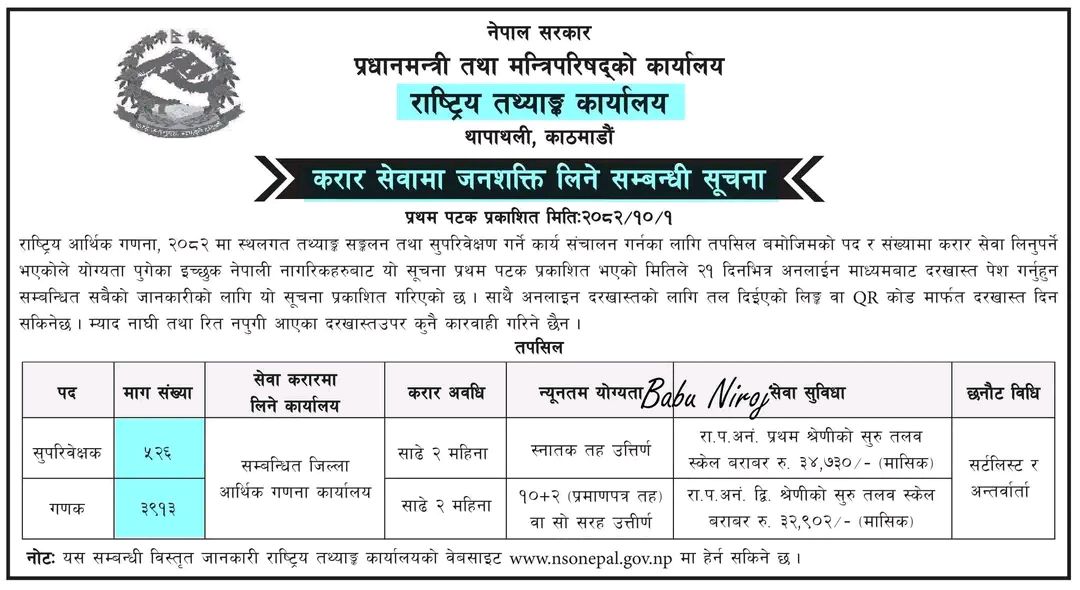यस सम्बन्धी थप विवरण तथा आवेदन प्रक्रिया राष्ट्रिय तथ्याङ्क कार्यालयको आधिकारिक वेबसाइट www.nsonepal.gov.np मा हेर्न सकिने जनाइएको छ।