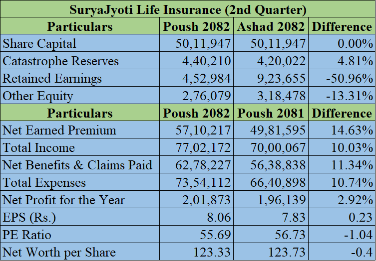 सूर्यज्योति लाइफको नाफा सँगै प्रतिशेयर आम्दानीमा सुधार, खुद बीमा शुल्क आर्जन ५ अर्ब ७१ करोड नाघ्यो
