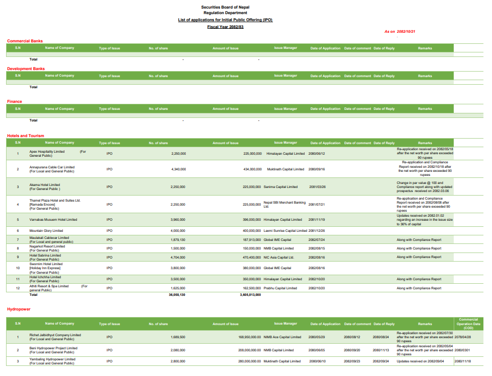 आवेदन दिने कम्पनीमध्ये होटल तथा पर्यटन समुहका १२ वटा कम्पनीले ३ अर्ब ६० करोड ५८ लाख १३ हजार रुपैयाँको आइपिओ निष्कासन गर्ने प्रस्ताव पेश गरेका छन्। पछिल्लो समय होटल तथा पर्यटन क्षेत्रमा लगानी आकर्षण बढेसँगै यस समुहका कम्पनीहरूको आइपिओ निष्कासन क्रम पनि तीव्र बन्दै गएको छ।