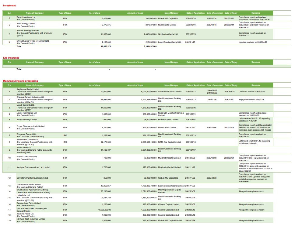 उत्पादन तथा प्रशोधन समुहका २५ वटा कम्पनीले ३१ अर्ब २७ करोड ३७ लाख ९१ हजार ७२५ रुपैयाँ बराबरको आइपिओ निष्कासन गर्ने तयारी गरेका छन्। यस समुहका अधिकांश कम्पनीले प्रिमियम मूल्यमा आइपिओ जारी गर्ने योजना बनाएका छन्। यस्तै, हाइड्रोपावर समुहतर्फ सबैभन्दा धेरै ३४ वटा कम्पनीले १६ अर्ब ४२ करोड रुपैयाँको आइपिओ निष्कासनका लागि आवेदन दिएका छन्। अन्य समुहका ११ वटा कम्पनीले ४ अर्ब ५७ करोड रुपैयाँको आइपिओ जारी गर्ने प्रस्ताव गरेका छन्। तीन वटा माइक्रोइन्स्योरेन्स कम्पनीले ६७ करोड ५० लाख रुपैयाँ तथा लगानी समुहका ४ वटा कम्पनीले ३ अर्ब १४ करोड रुपैयाँको आइपिओ निष्कासन गर्ने भएका छन्।