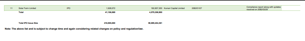 चालु आर्थिक वर्षको पहिलो ६ महिनामा १५ वटा कम्पनीले २७ अर्ब २९ करोड रुपैयाँको आइपिओ निष्कासन गर्न अनुमति पाइसकेका छन्। यीमध्ये केही कम्पनी निष्कासन प्रक्रियामा छन् भने केही तयारीको चरणमा रहेको जनाइएको छ।