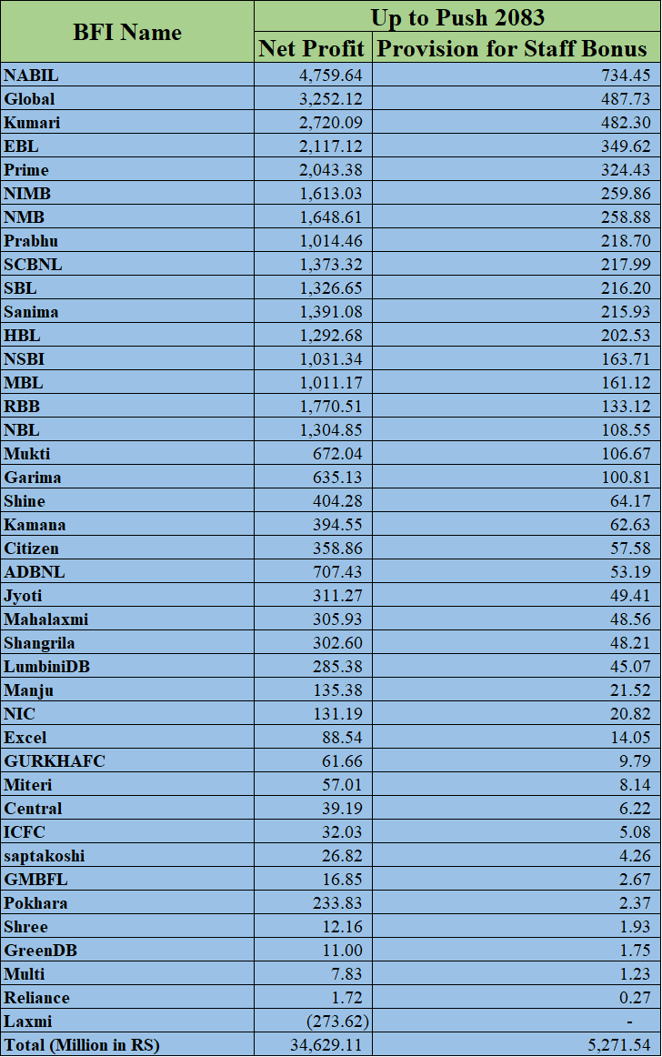 चालु आर्थिक वर्षको ६ महिनामा बैंक वित्तीय संस्थाले ३४ अर्ब ६२ करोड रुपैयाँ मुनाफा आर्जन गरेका छन्। यस मुनाफाबाट बैंकहरुले कर्मचारीले पाउने बोनसका लागि ५ अर्ब २७ करोड रुपैयाँ प्रोभिजनिङ गरेका छन्। बोनस ऐन २०३० अनुसार कम्पनी तथा संस्थाले मुनाफाको १० प्रतिशत रकम बोनसका लागि छुट्याउनु पर्छ। यो रकम आर्थिक वर्ष समाप्त भएपछि वा लेखापरीक्षण सम्पन्न भएपछि वितरण गरिन्छ। यस्तो बोनस रकम कम्पनी तथा संस्थाले मुनाफा गरेको खण्डमा मात्रै वितरण हुन्छ।