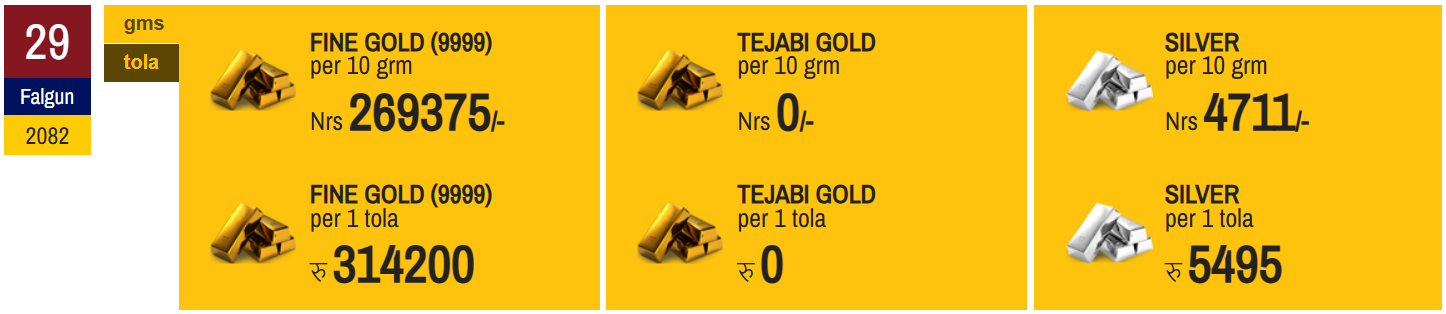 काठमाडौँ । नेपाली बजारमा शुक्रबार सुन र चाँदी दुवै धातुको मूल्यमा गिरावट देखिएको छ। अघिल्लो दिनको तुलनामा सुन र चाँदीको भाउ घटेको नेपाल सुनचाँदी व्यवसायी महासंघले जनाएको छ।