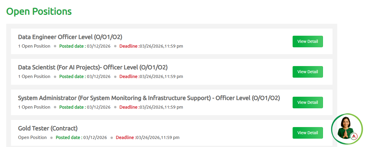 बैंकका अनुसार डाटा इन्जिनियर, डाटा साइन्टिस्ट, सिस्टम एड्मिनिस्ट्रेटर तथा गोल्ड टेस्टर पदका लागि आवेदन माग गरिएको छ। इच्छुक तथा योग्य उम्मेदवारले बैंकको आधिकारिक वेबसाइटमार्फत सम्बन्धित पदको विस्तृत विवरण हेरेर आवेदन दिन सक्नेछन्।