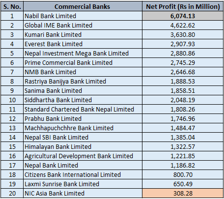 प्रतिवेदनअनुसार वाणिज्य बैंकहरूको सामूहिक खुद नाफा रु. ४३ अर्ब २१ करोड पुगेको छ। यस अवधिमा Nabil Bank Limitedले रु. ६ अर्ब ७ करोड खुद नाफा कमाउँदै अग्रस्थान कायम गरेको छ। त्यसैगरी Global IME Bank Limited रु. ४ अर्ब ६२ करोड नाफासहित दोस्रो स्थानमा रहेको छ।