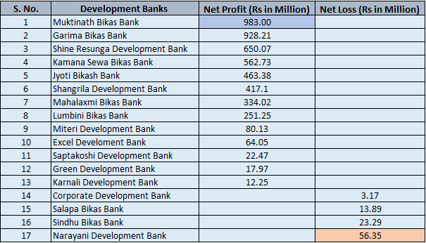 तल्लो तहमा रहेका Green Development Bank र Karnali Development Bankले क्रमशः रु. १ करोड ७९ लाख र रु. १ करोड २२ लाख मात्र नाफा आर्जन गरेका छन्।