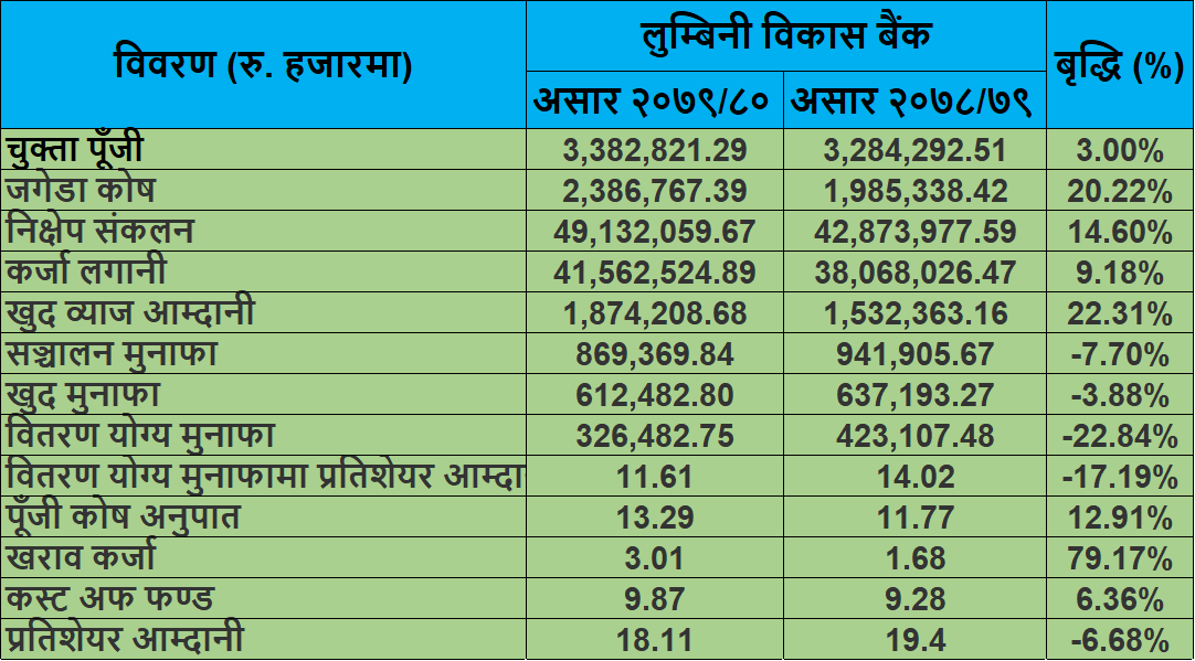 लुम्बिनी विकास बैंकको मुनाफा ६१ करोड १२ लाख, प्रतिशेयर आम्दानी १८ रुपैयाँ