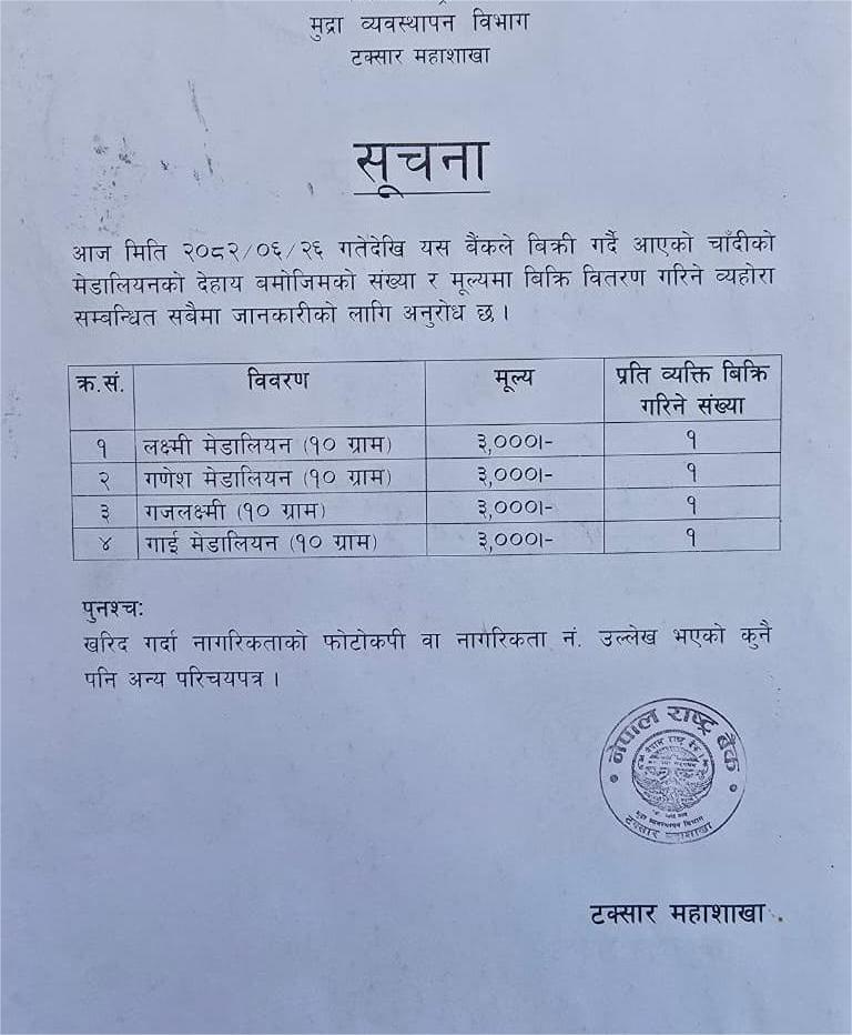 केन्द्रीय बैंकले यसपालि चार प्रकारका चाँदीका सिक्काहरू बिक्रीमा ल्याएको छ। ती सिक्काहरू १० ग्राम तौलका छन् र प्रति सिक्काको मूल्य ३,००० रुपैयाँ निर्धारण गरिएको छ। उपलब्ध सिक्काहरूमा लक्ष्मी मेडालियन, गणेश मेडालियन, गजलक्ष्मी मेडालियन र गाई मेडालियन रहेका छन्।
