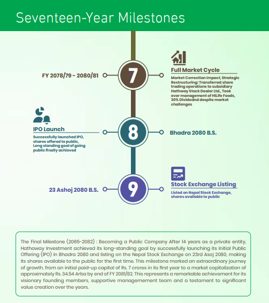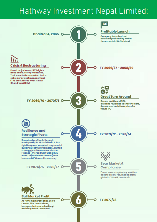 २०६५ चैत १४ गते स्थापना भएको हाथवे इन्भेष्टमेन्टले प्रारम्भिक तीन महिनामै लाभांश वितरण गर्दै उत्साहजनक यात्रा सुरु गरेको थियो। त्यसपछि २०६९ देखि २०७१ को अवधिमा कम्पनीले सानदार प्रगति गर्दै IPO निष्काशन गर्ने सपना देख्यो।
