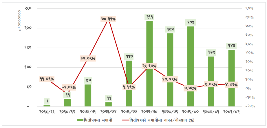 कम्पनीले दीर्घकालीन लगानीमा भने उल्लेखनीय वृद्धि गर्दै रु. १५ करोड १० लाखको नयाँ लगानी गरेको छ। तथापि, शेयर बजारमै लगानीको सन्दर्भमा कम्पनीले प्रक्षेपण गरेको रु. २ अर्ब ३९ करोडको तुलनामा रु. १ अर्ब ४५ करोड मात्र लगानी गर्यो, जुन ३९ प्रतिशतले कम हो।