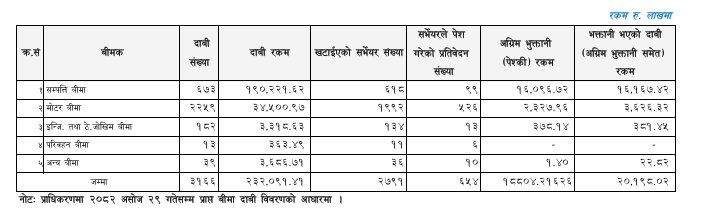 त्यस्तै, नेपाल पुनर्बीमा कम्पनीमा निर्जीवन बीमा कम्पनीहरूले २ हजार ७३३ वटा पुनर्बीमा दाबी गरेका छन्, जसअन्तर्गत पुनर्बीमा दाबी रकम करिब १५ अर्ब ७६ करोड ४३ लाख रुपैयाँ रहेको छ। यसमध्ये करिब १ अर्ब ६३ करोड ३५ लाख रुपैयाँ पुनर्बीमा कम्पनीले निर्जीवन बीमा कम्पनीहरूलाई अग्रिम भुक्तानी गरिसकेको छ।