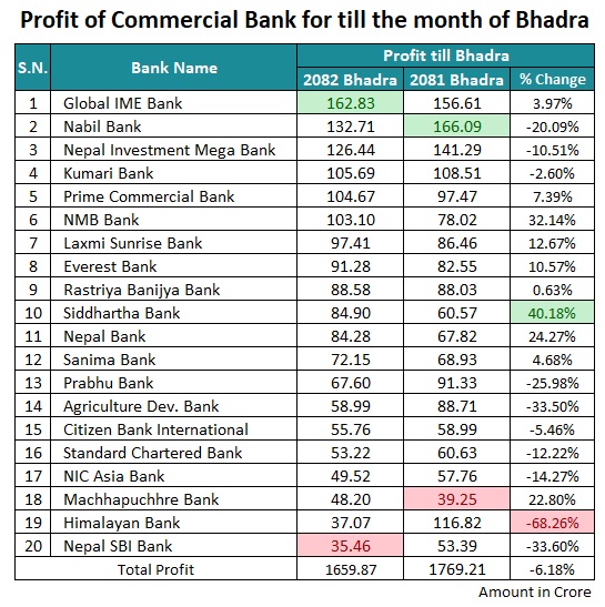 यता, सबैभन्दा धेरै नाफा घट्ने बैंकको सूचीमा हिमालयन बैंक पहिलो स्थानमा छ। बैंकको नाफा ६८.२६ प्रतिशतले घटेर ३७ करोड ७ लाख रुपैयाँमा सीमित भएको छ। नेपाल एसबीआई बैंकको नाफा ३३.५९ प्रतिशतले घटेर ३५ करोड ४५ लाख रुपैयाँमा झरेको छ। कृषि विकास बैंकको नाफा ३३.५० प्रतिशत घटेर ५८ करोड ९८ लाख, प्रभु बैंकको २५.९७ प्रतिशतले घटेर ६७ करोड ६० लाख, एनआइसी एशिया बैंकको १४.२६ प्रतिशतले घटेर ४९ करोड ५१ लाख, स्ट्यान्डर्ड चार्टर्ड बैंक र सिटिजन्स बैंकको दुवै नाफा १२.२१ प्रतिशत र ५.६० प्रतिशतले घटेर ५३ करोड २२ लाख रुपैयाँमा सीमित भएको छ।