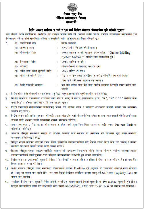 बोलकबोल अनलाइन खरिद प्रणालीमार्फत हुनेछ र ब्याजदर पनि सोही माध्यमबाट निर्धारण हुनेछ। निक्षेप संकलन उपकरणको सावाँ तथा ब्याजको भुक्तानी मंसिर २१ गते २०८२ मा हुने राष्ट्र बैंकले जनाएको छ। बोल गर्न सकिने न्यूनतम रकम १० करोड रुपैयाँ तोकिएको छ भने अधिकतम सीमा कुल आह्वान रकमसम्म ५ करोड रुपैयाँले भाग जाने गरी निर्धारण गरिएको छ।