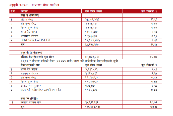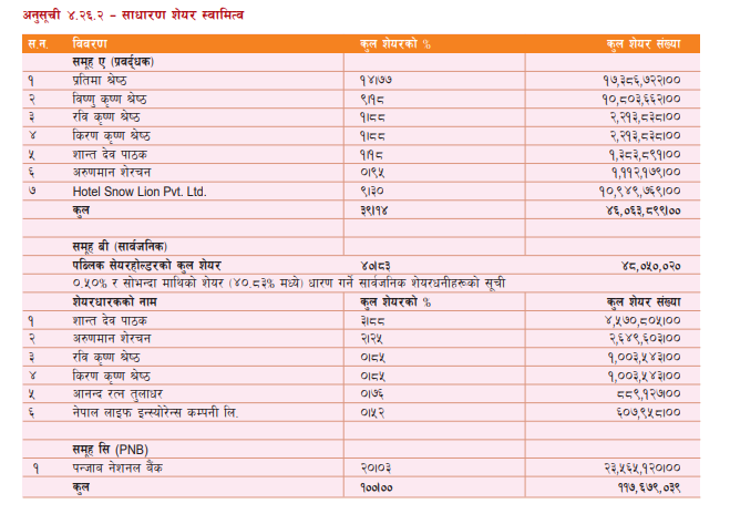 संस्थापक शेयरधनी समुह तर्फ बाँकी ठुला लगानीकर्ता रवि करण श्रेष्ठ १.८८ प्रतिशत, किरण कृष्ण श्रेष्ठ १.८८ प्रतिशत, शान्तदेव पाठक १.१८ प्रुतिशत, अरुणमान शेरचनको ०.९५ प्रतिशत र होटल स्नोलाइनको ९.३० प्रतिशत रहेको छ।